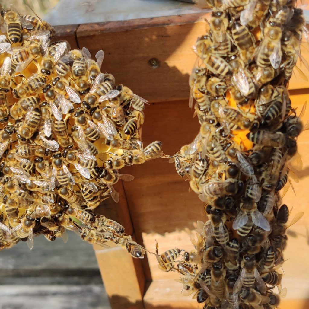 Hier siehst du eine sogenannte Baukette. Die Bienen arbeiten eng zusammen, produzieren Wachs und formen daraus neue Waben.